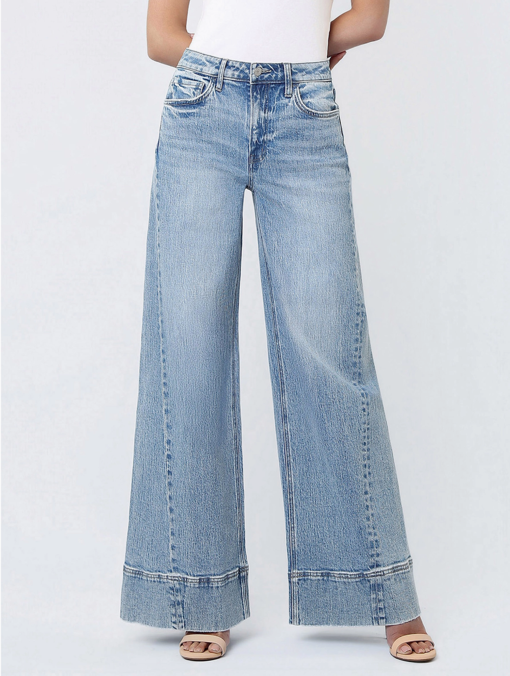 Step into comfort and style with April's Daydream High Waist Extreme Wide Leg Jeans. These statement-making jeans feature a flattering high-rise cut and dramatically wide legs that let you move freely while turning heads. The eye-catching metal buckle detail on the back adds an edgy touch of personality to your everyday look. Perfect for anyone ready to embrace bold, unapologetic fashion that feels as good as it looks.