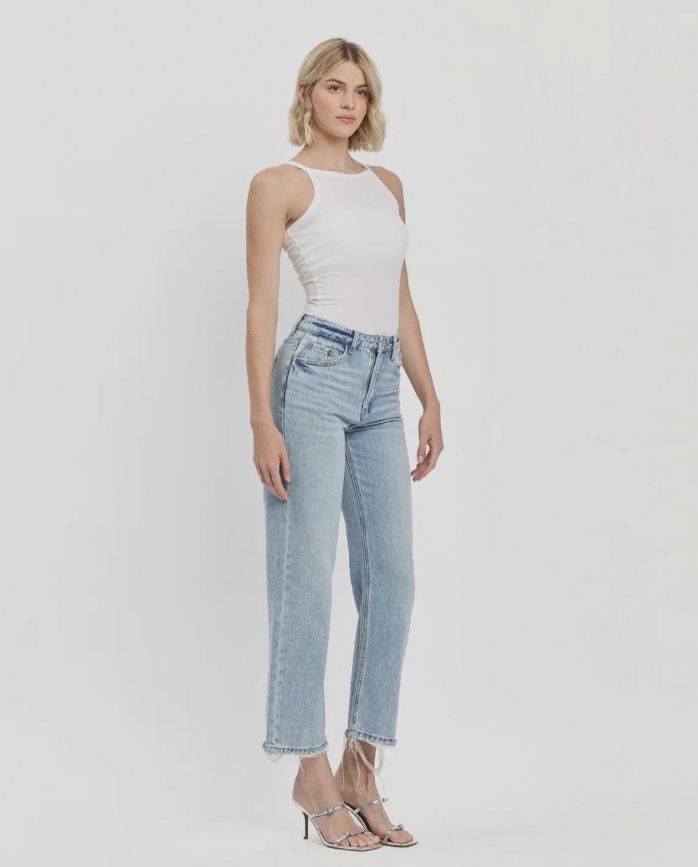 Non stretch denim, super high rise, 5 pockets, distressed detail, ankle length, light wash, 90's slim wide jeans