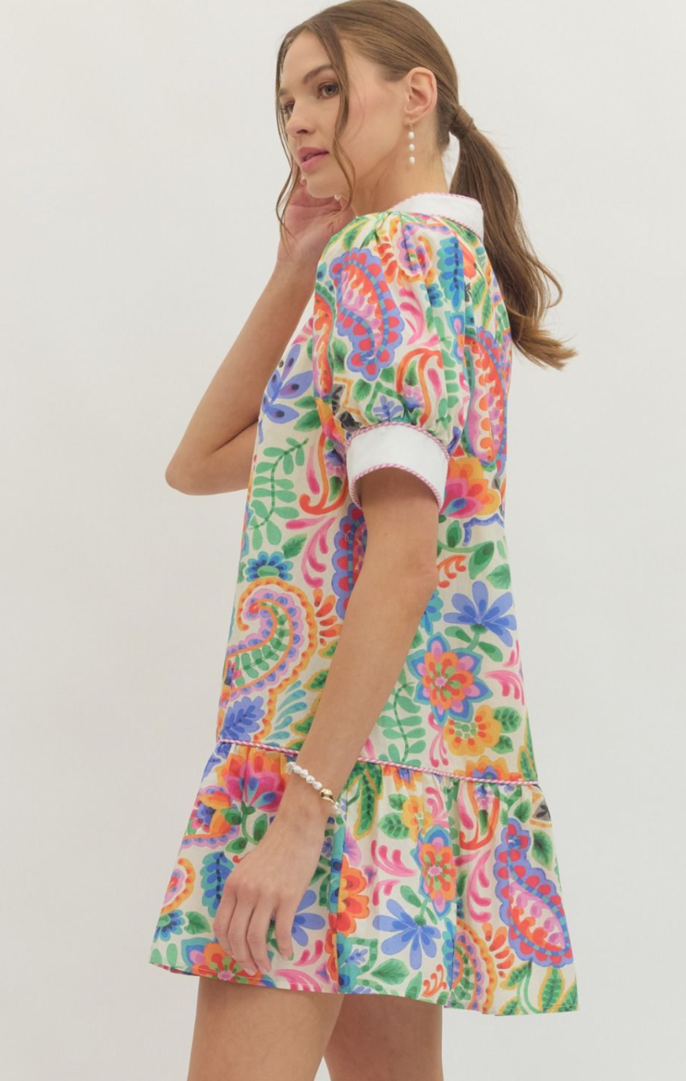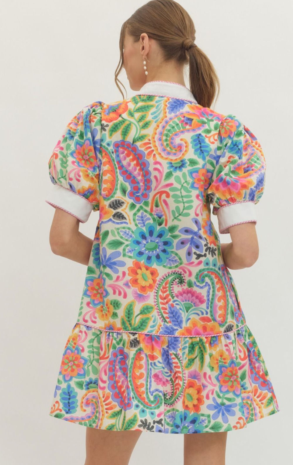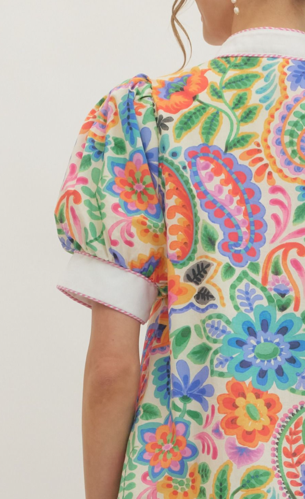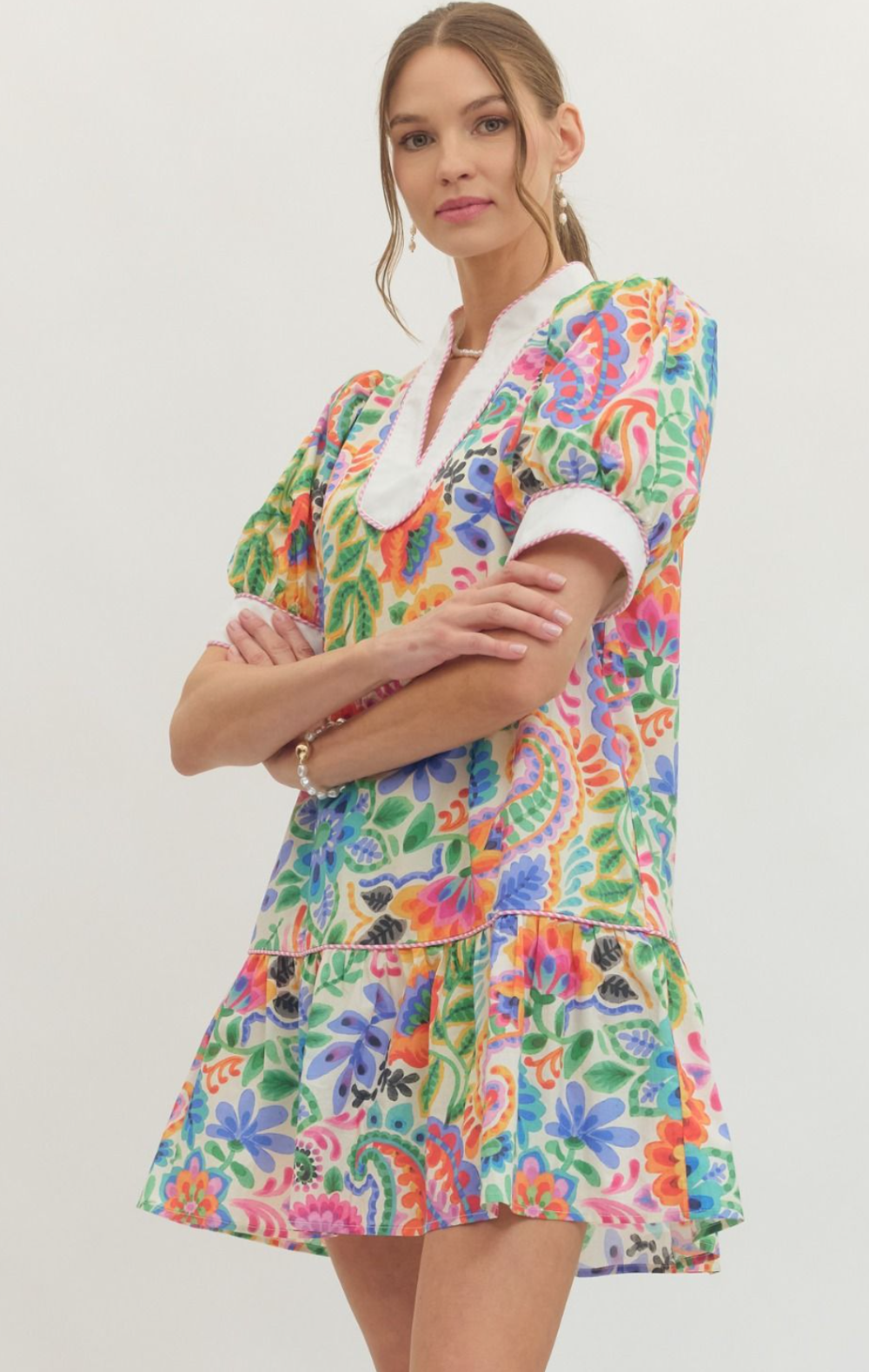 Charm meets practical style with the Sophie Printed Mini Dress. Featuring romantic puff sleeves and a striking contrast V-neck band collar that frames the neckline beautifully. The coordinating contrast trim on the sleeves adds visual interest, while functional side pockets keep your essentials close. Fully lined for comfort and confidence. Perfect for all of your summer occasions.
