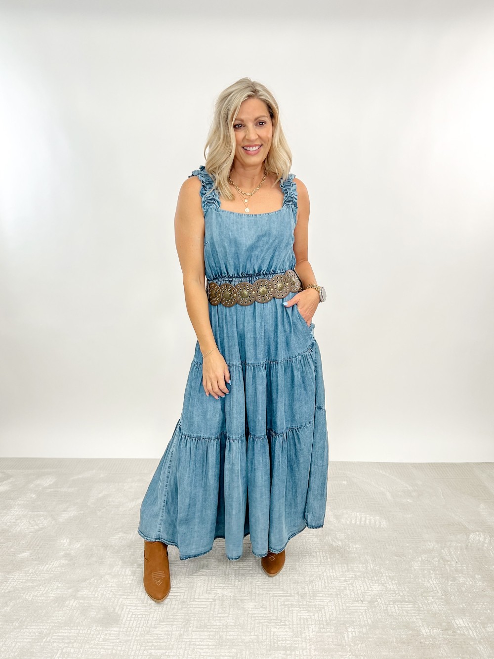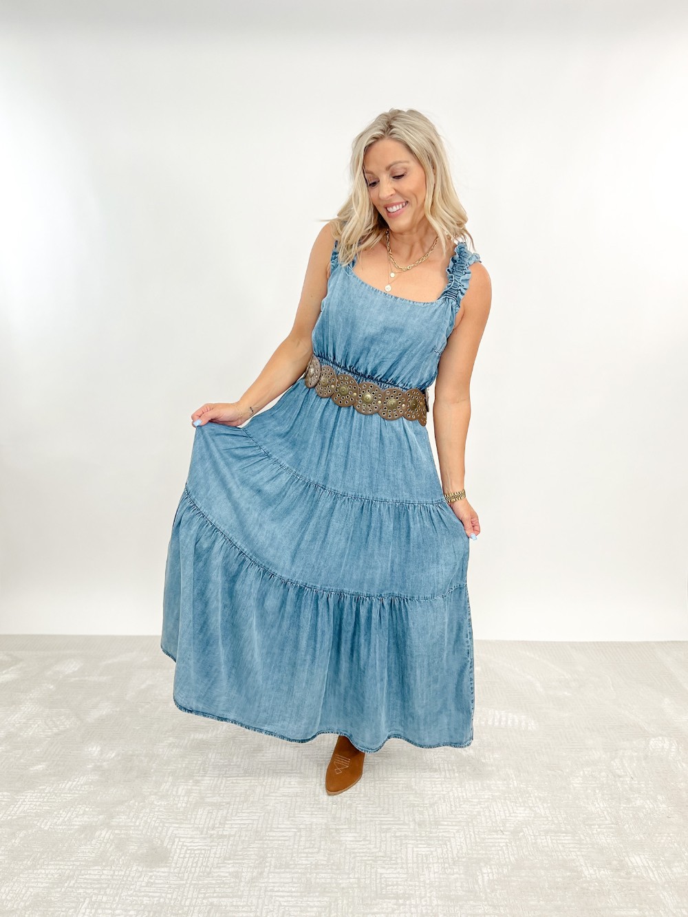 Chambray Daydreamer Tiered Midi Dress, Washed Denim