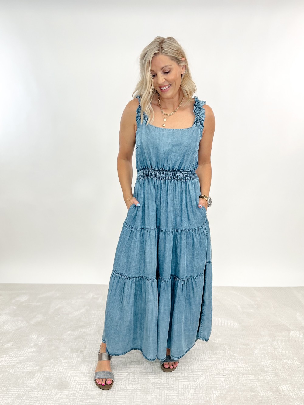 The Chambray Daydreamer Maxi is your go-to for laid-back charm with a feminine touch. Lightweight and breathable, this tiered maxi features ruffle shoulder straps, a smocked waist for a flattering fit, and a square neckline that gives it a timeless feel. Finished with flowy ruching and convenient side pockets, it’s perfect for sunny strolls, weekend markets, or effortless brunch style.