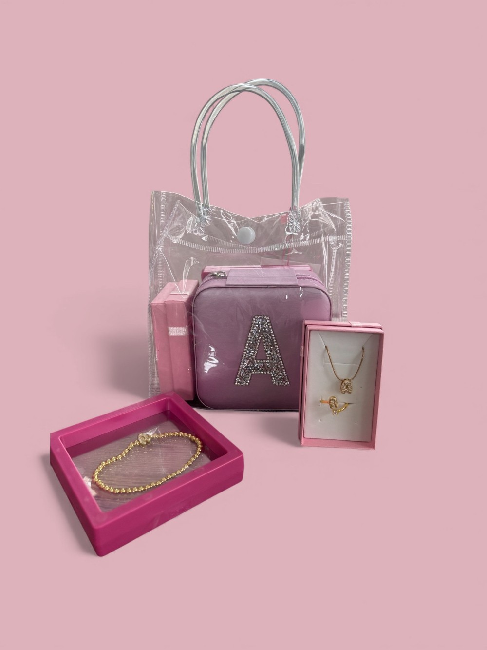 Gift Set includes Jewelry Box, Necklace, Ring and Bracelet. Colors of boxes that the bracelet and ring come in may vary depending on stock. All adjustable sizing. Jewelry box comes in purple, pink and hot pink please call store if you want a specific color.