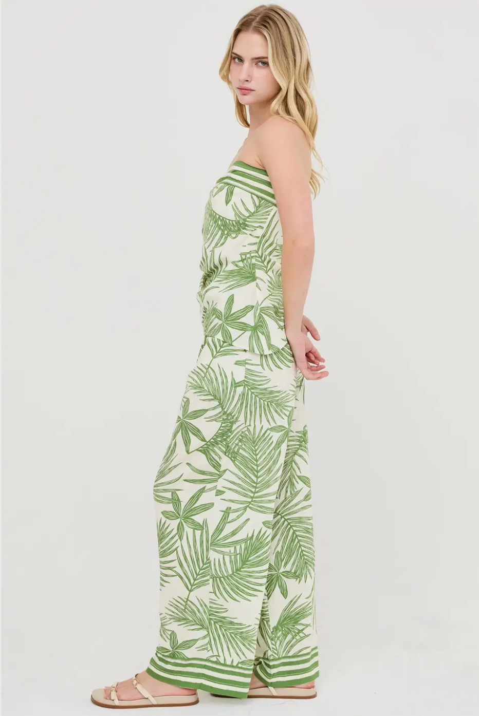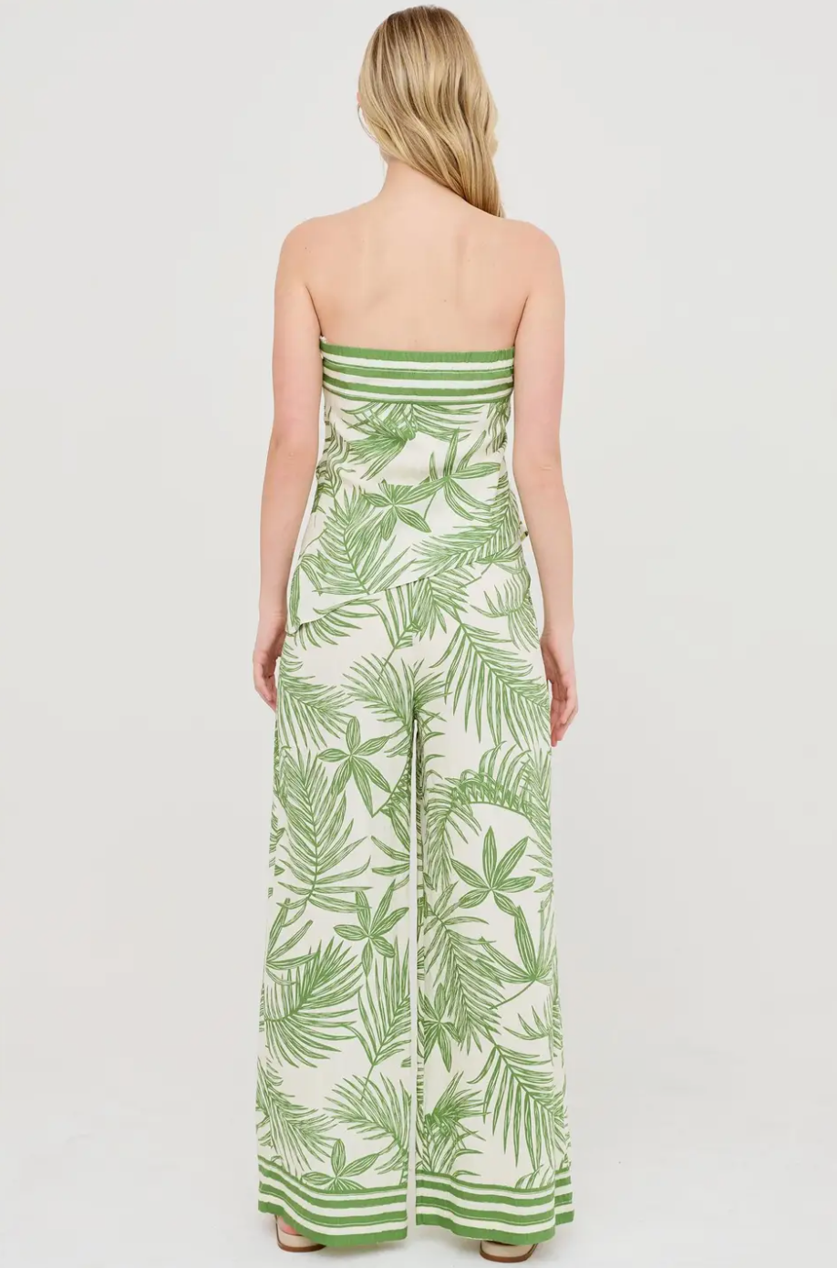 The Josie Leaf Print Set combines sophisticated design with practical details. This strapless asymmetrical top features an invisible side zipper for easy on-and-off wear, while the matching wide-leg pants offer comfort and style with functional front pockets and a sleek front zipper. The coordinated leaf print creates a cohesive, polished look perfect for any occasion. Wear together as a complete set or mix and match with your existing wardrobe for endless styling possibilities.