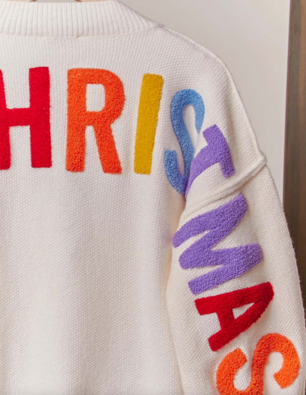 Spread holiday cheer with this festive oversize Christmas sweater featuring a jolly "Ho! Ho! Ho!" message splashed across the front in vibrant, colorful letters. Flip it around to reveal "Merry Christmas" on the back—perfect for showing off your seasonal spirit from every angle. Whether you're heading to a holiday party or cozying up by the fire, this playful knit brings instant Christmas magic to your wardrobe. Get ready to turn heads and spread smiles all season long!