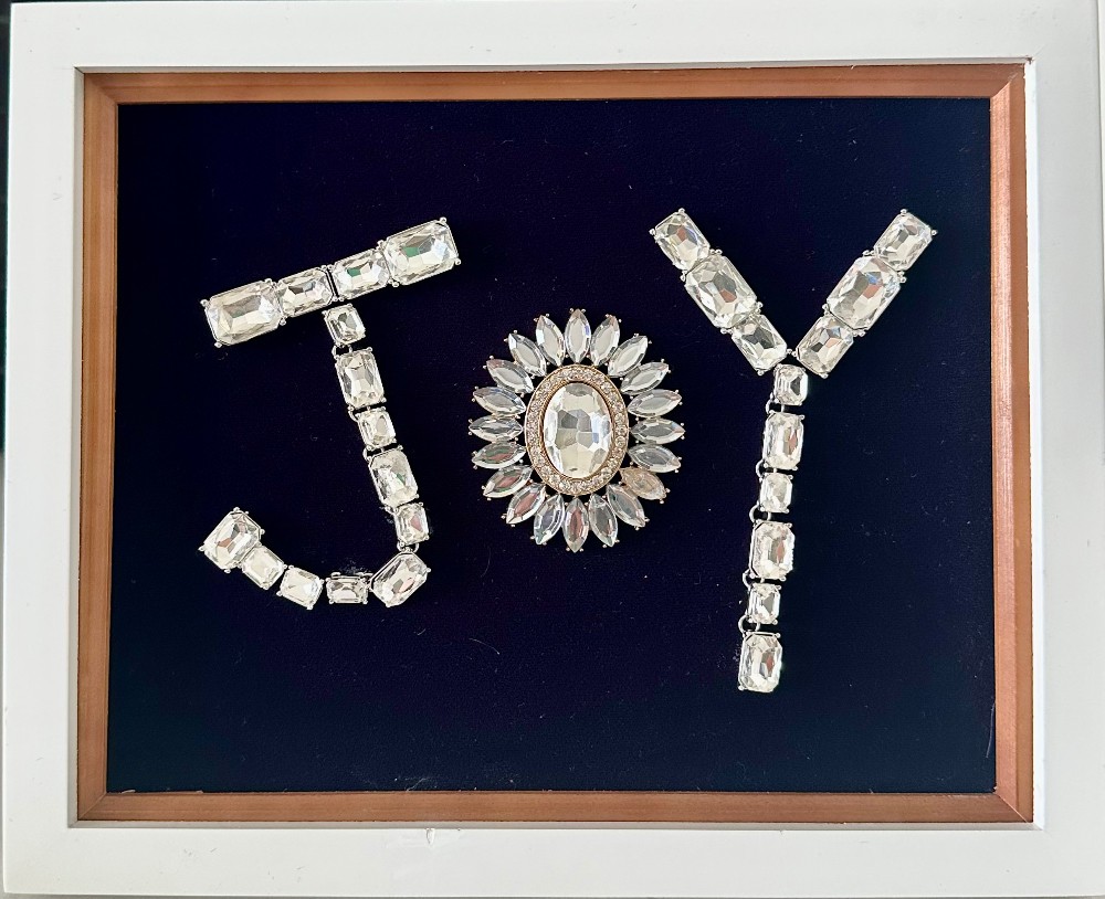 A 9"x11" white wooden frame with a beveled wooden inside frame and a deep purple velvet background. This beautiful "JOY" is made up of large rhinestones with a very large broach for the "O". Stunning!